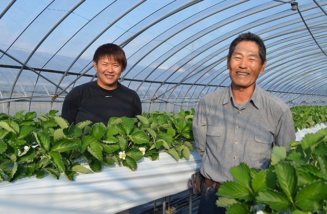 イチゴの収穫期は12月から4月頃まで。父の支援を受けているとはいえ、出荷のピーク時にはパック詰め作業や収穫株の手入れと多忙を極めます。頼れるのは自分だけと自ら鼓舞しながらの日々。5月から9月は苗づくり期で10月にはビニール張り作業と年間を通してほぼ休みなし。「11月にちょっとだけホッとできますよ」と笑顔の吉田さん。今後の目標は収穫量の増大と生産効率を上げること。また、同世代のイチゴ農家との交流と意見交換をしてみたいそうです。「美味しかったと言ってもらえるのがなにより嬉しくて。とても励みになります」。起業して苦労を乗り越えてきた生産者としての自負が表情に溢れているようです。JAとしても次代を担う若き生産者を全力で応援していきます。