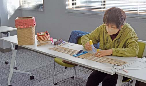 色々なものが作れるクラフトバンド。今回は、スーパー袋を被せても隠せる蓋付きのゴミ箱を作りました。最初にクラフトバンドを、パーツ毎に必要な本数に長さを測って切りそろえるところからスタート。クラフトバンドは反発があり、測って切るのも手間が掛かります。各自、自分のペースで楽しく進めることができました。