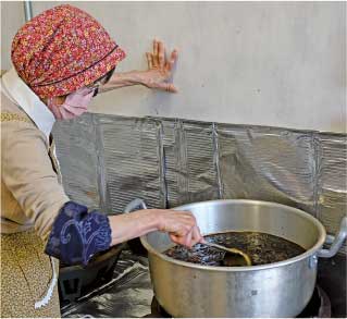 今年も各地区でいばら饅頭作りが行われました。この日は多気の調理室に5人のメンバーが集まり、各自庭で採ったさるとりいばらの葉を持ち寄って作りました。